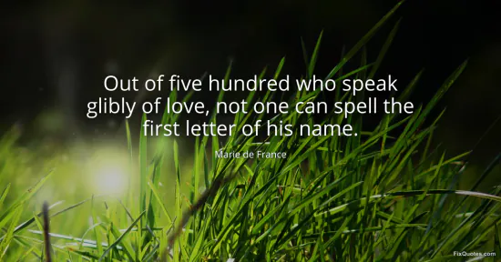 France, Marie de. "Out of five hundred who speak glibly of love, not one can spell the first letter of his name." FixQuotes. January 17, 2026. https://fixquotes.com/quotes/out-of-five-hundred-who-speak-glibly-of-love-not-79552/.