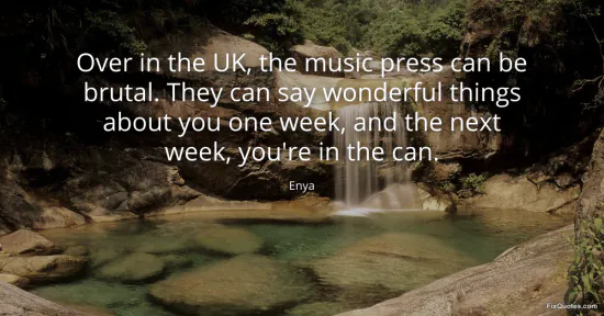 Enya. "Over in the UK, the music press can be brutal. They can say wonderful things about you one week, and the next week, you're in the can." FixQuotes. January 17, 2026. https://fixquotes.com/quotes/over-in-the-uk-the-music-press-can-be-brutal-they-58705/.