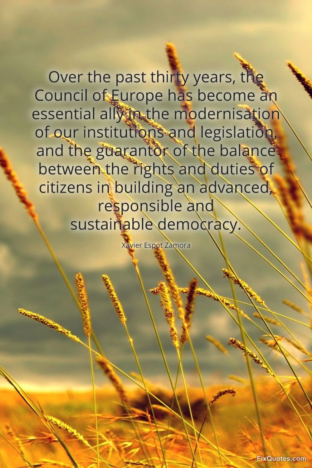 Zamora, Xavier Espot. (2026, February 15). Over the past thirty years, the Council of Europe has become an essential ally in the modernisation of our institutions and legislation, and the guarantor of the balance between the rights and duties of citizens in building an advanced, responsible and sustainable democracy. FixQuotes. https://fixquotes.com/quotes/over-the-past-thirty-years-the-council-of-europe-185360/
