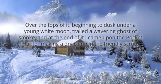 "Over the tops of it, beginning to dusk under a young white moon, trailed a wavering ghost of smoke, and at the end of it I came upon the Pocket Hunter making a dry camp in the friendly scrub." FixQuotes, 15 Jan. 2026, https://fixquotes.com/quotes/over-the-tops-of-it-beginning-to-dusk-under-a-166271/. Accessed 22 Feb. 2026.