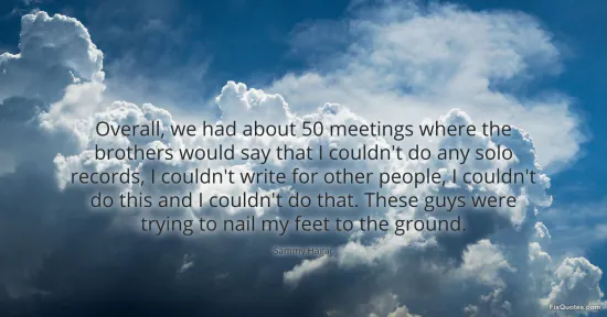 Hagar, Sammy. (2026, January 16). Overall, we had about 50 meetings where the brothers would say that I couldn't do any solo records, I couldn't write for other people, I couldn't do this and I couldn't do that. These guys were trying to nail my feet to the ground. FixQuotes. https://fixquotes.com/quotes/overall-we-had-about-50-meetings-where-the-109872/