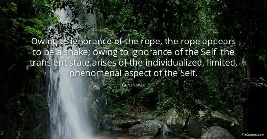 Nanak, Guru. (2026, February 16). Owing to ignorance of the rope, the rope appears to be a snake; owing to ignorance of the Self, the transient state arises of the individualized, limited, phenomenal aspect of the Self. FixQuotes. https://fixquotes.com/quotes/owing-to-ignorance-of-the-rope-the-rope-appears-121394/