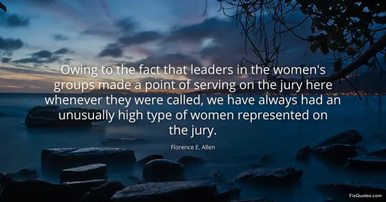 Allen, Florence E. (2026, January 16). Owing to the fact that leaders in the women's groups made a point of serving on the jury here whenever they were called, we have always had an unusually high type of women represented on the jury. FixQuotes. https://fixquotes.com/quotes/owing-to-the-fact-that-leaders-in-the-womens-132700/