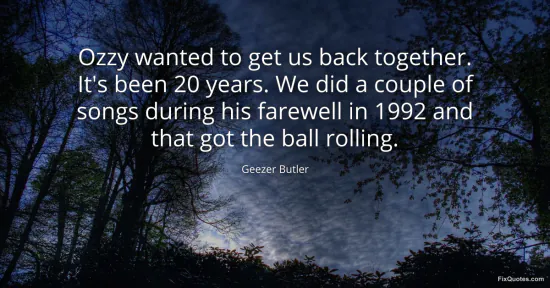 Butler, Geezer. "Ozzy wanted to get us back together. It's been 20 years. We did a couple of songs during his farewell in 1992 and that got the ball rolling." FixQuotes. January 15, 2026. https://fixquotes.com/quotes/ozzy-wanted-to-get-us-back-together-its-been-20-164696/.