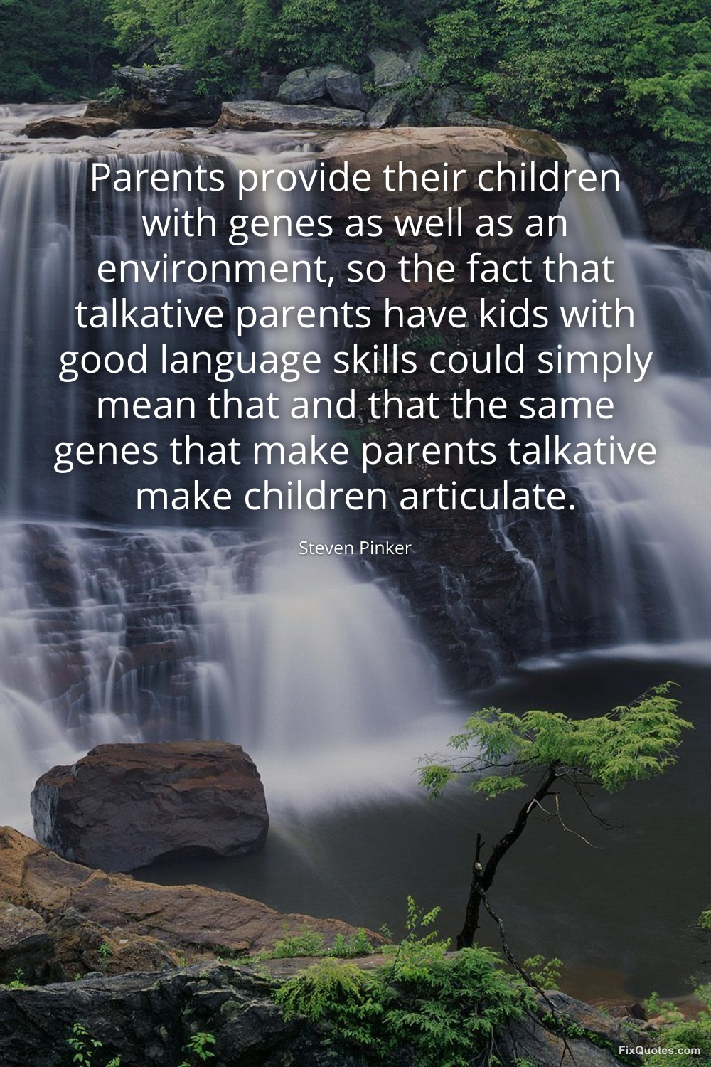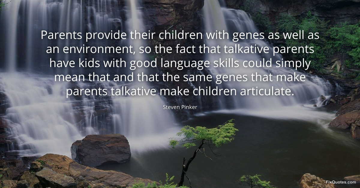 Pinker, Steven. (2026, January 16). Parents provide their children with genes as well as an environment, so the fact that talkative parents have kids with good language skills could simply mean that and that the same genes that make parents talkative make children articulate. FixQuotes. https://fixquotes.com/quotes/parents-provide-their-children-with-genes-as-well-99088/