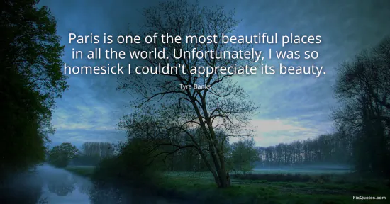 Banks, Tyra. (2026, January 16). Paris is one of the most beautiful places in all the world. Unfortunately, I was so homesick I couldn't appreciate its beauty. FixQuotes. https://fixquotes.com/quotes/paris-is-one-of-the-most-beautiful-places-in-all-131189/