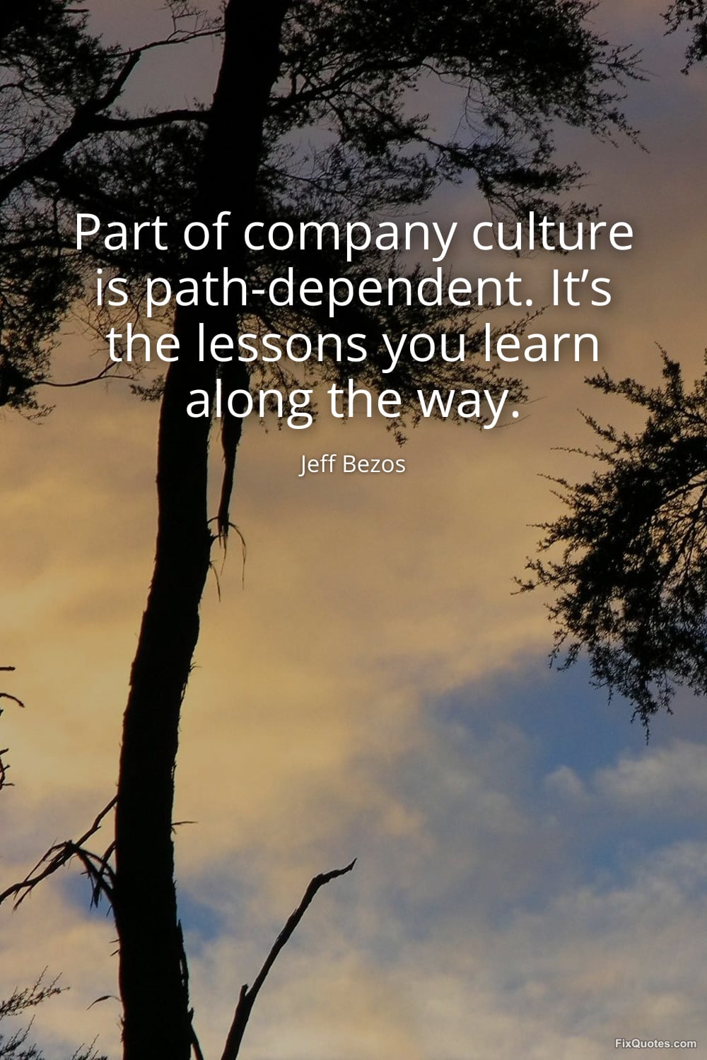 Bezos, Jeff. (2026, March 25). Part of company culture is path-dependent. It’s the lessons you learn along the way. FixQuotes. https://fixquotes.com/quotes/part-of-company-culture-is-path-dependent-its-the-186487/