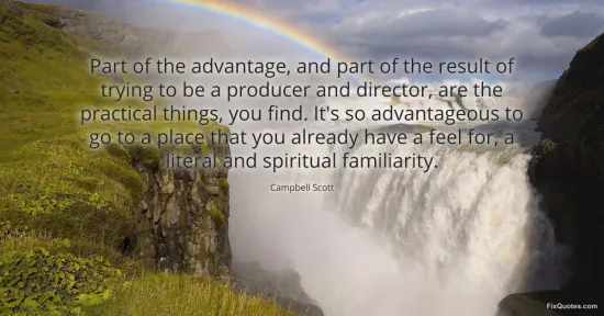 Scott, Campbell. "Part of the advantage, and part of the result of trying to be a producer and director, are the practical things, you find. It's so advantageous to go to a place that you already have a feel for, a literal and spiritual familiarity." FixQuotes. January 17, 2026. https://fixquotes.com/quotes/part-of-the-advantage-and-part-of-the-result-of-44564/.