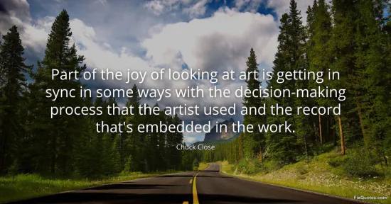 Close, Chuck. "Part of the joy of looking at art is getting in sync in some ways with the decision-making process that the artist used and the record that's embedded in the work." FixQuotes. January 15, 2026. https://fixquotes.com/quotes/part-of-the-joy-of-looking-at-art-is-getting-in-143345/.