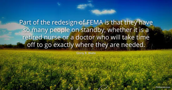 Waite, Ginny B. (2026, January 17). Part of the redesign of FEMA is that they have so many people on standby, whether it is a retired nurse or a doctor who will take time off to go exactly where they are needed. FixQuotes. https://fixquotes.com/quotes/part-of-the-redesign-of-fema-is-that-they-have-so-60832/