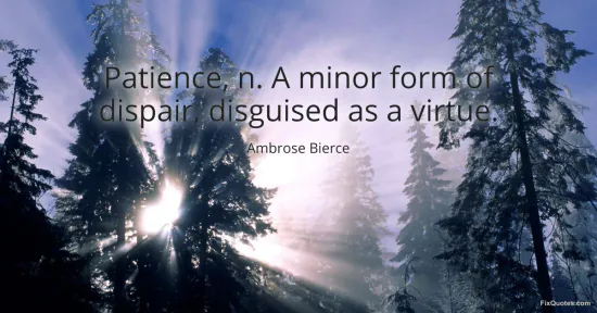 "Patience, n. A minor form of dispair, disguised as a virtue." FixQuotes, 17 Jan. 2026, https://fixquotes.com/quotes/patience-n-a-minor-form-of-dispair-disguised-as-a-40547/. Accessed 10 Feb. 2026.