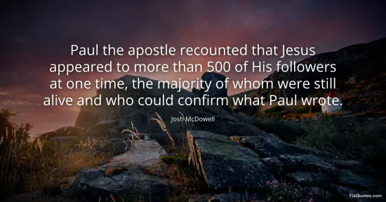 McDowell, Josh. "Paul the apostle recounted that Jesus appeared to more than 500 of His followers at one time, the majority of whom were still alive and who could confirm what Paul wrote." FixQuotes. January 16, 2026. https://fixquotes.com/quotes/paul-the-apostle-recounted-that-jesus-appeared-to-92075/.