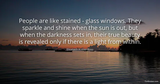 Kubler-Ross, Elisabeth. (2026, February 12). People are like stained - glass windows. They sparkle and shine when the sun is out, but when the darkness sets in, their true beauty is revealed only if there is a light from within. FixQuotes. https://fixquotes.com/quotes/people-are-like-stained-glass-windows-they-2972/