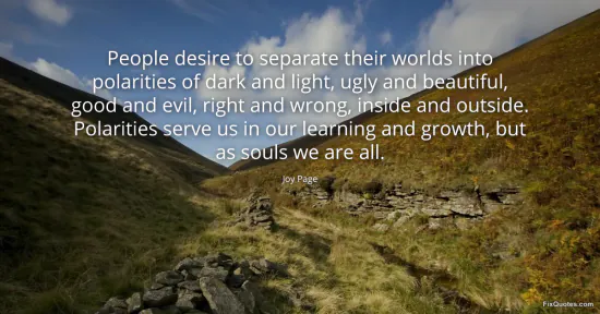 Page, Joy. "People desire to separate their worlds into polarities of dark and light, ugly and beautiful, good and evil, right and wrong, inside and outside. Polarities serve us in our learning and growth, but as souls we are all." FixQuotes. January 17, 2026. https://fixquotes.com/quotes/people-desire-to-separate-their-worlds-into-47145/.