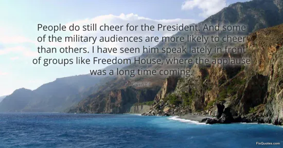 "People do still cheer for the President. And some of the military audiences are more likely to cheer than others. I have seen him speak lately in front of groups like Freedom House, where the applause was a long time coming." FixQuotes, 17 Jan. 2026, https://fixquotes.com/quotes/people-do-still-cheer-for-the-president-and-some-79081/. Accessed 22 Feb. 2026.