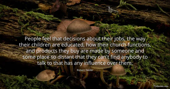Teeter, Robert. "People feel that decisions about their jobs, the way their children are educated, how their church functions, and products they buy are made by someone and some place so distant that they can't find anybody to talk to that has any influence over them." FixQuotes. January 16, 2026. https://fixquotes.com/quotes/people-feel-that-decisions-about-their-jobs-the-98524/.