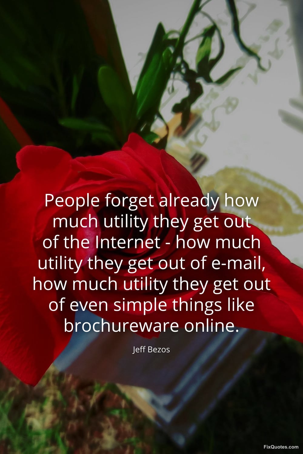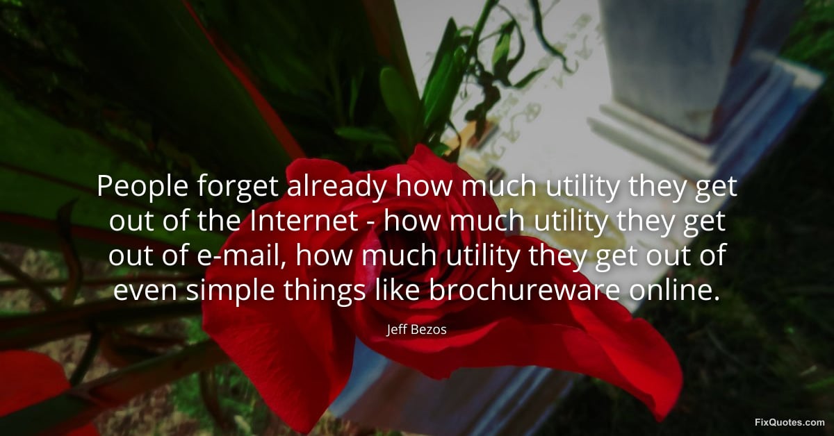 Bezos, Jeff. (2026, March 25). People forget already how much utility they get out of the Internet - how much utility they get out of e-mail, how much utility they get out of even simple things like brochureware online. FixQuotes. https://fixquotes.com/quotes/people-forget-already-how-much-utility-they-get-186488/