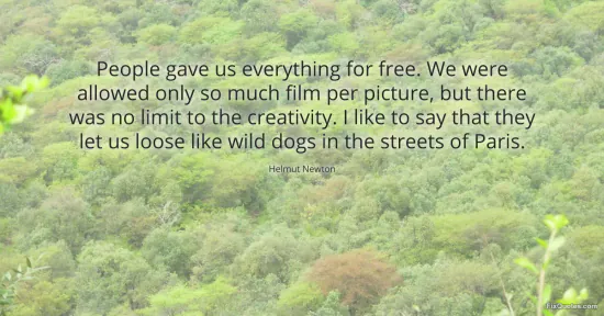 Newton, Helmut. "People gave us everything for free. We were allowed only so much film per picture, but there was no limit to the creativity. I like to say that they let us loose like wild dogs in the streets of Paris." FixQuotes. January 17, 2026. https://fixquotes.com/quotes/people-gave-us-everything-for-free-we-were-59693/.