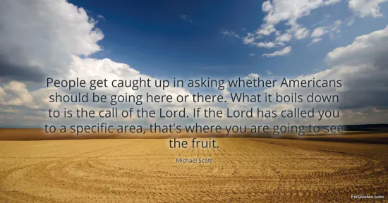 Scott, Michael. "People get caught up in asking whether Americans should be going here or there. What it boils down to is the call of the Lord. If the Lord has called you to a specific area, that's where you are going to see the fruit." FixQuotes. January 16, 2026. https://fixquotes.com/quotes/people-get-caught-up-in-asking-whether-americans-88330/.