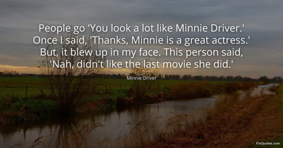 Driver, Minnie. "People go 'You look a lot like Minnie Driver.' Once I said, 'Thanks, Minnie is a great actress.' But, it blew up in my face. This person said, 'Nah, didn't like the last movie she did.'." FixQuotes. January 15, 2026. https://fixquotes.com/quotes/people-go-you-look-a-lot-like-minnie-driver-once-166322/.