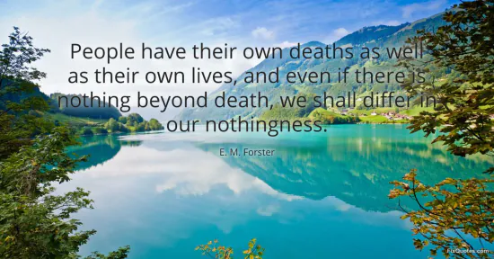 Forster, E. M. (2026, January 17). People have their own deaths as well as their own lives, and even if there is nothing beyond death, we shall differ in our nothingness. FixQuotes. https://fixquotes.com/quotes/people-have-their-own-deaths-as-well-as-their-own-33171/