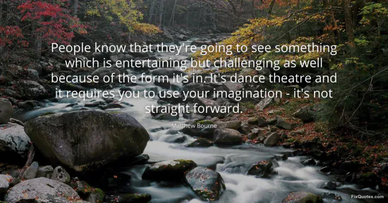 Bourne, Matthew. "People know that they're going to see something which is entertaining but challenging as well because of the form it's in. It's dance theatre and it requires you to use your imagination - it's not straight forward." FixQuotes. January 15, 2026. https://fixquotes.com/quotes/people-know-that-theyre-going-to-see-something-170800/.