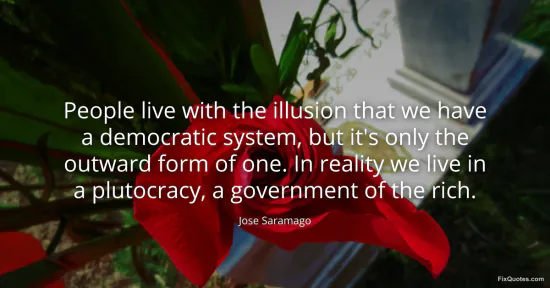 Saramago, Jose. (2026, January 15). People live with the illusion that we have a democratic system, but it's only the outward form of one. In reality we live in a plutocracy, a government of the rich. FixQuotes. https://fixquotes.com/quotes/people-live-with-the-illusion-that-we-have-a-144236/