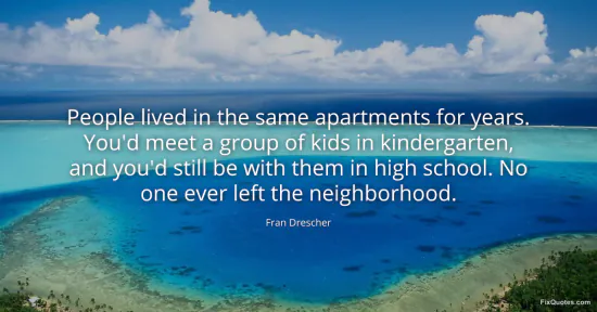 Drescher, Fran. (2026, January 17). People lived in the same apartments for years. You'd meet a group of kids in kindergarten, and you'd still be with them in high school. No one ever left the neighborhood. FixQuotes. https://fixquotes.com/quotes/people-lived-in-the-same-apartments-for-years-50332/
