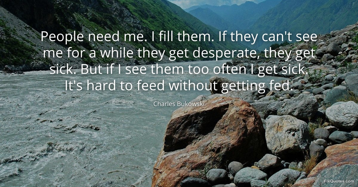 Bukowski, Charles. (2026, February 10). People need me. I fill them. If they can't see me for a while they get desperate, they get sick. But if I see them too often I get sick. It's hard to feed without getting fed. FixQuotes. https://fixquotes.com/quotes/people-need-me-i-fill-them-if-they-cant-see-me-185234/