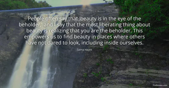 Hayek, Salma. "People often say that 'beauty is in the eye of the beholder,' and I say that the most liberating thing about beauty is realizing that you are the beholder. This empowers us to find beauty in places where others have not dared to look, including inside ourselves." FixQuotes. January 16, 2026. https://fixquotes.com/quotes/people-often-say-that-beauty-is-in-the-eye-of-the-130681/.