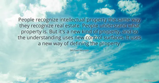 Nesmith, Michael. (2026, January 15). People recognize intellectual property the same way they recognize real estate. People understand what property is. But it's a new kind of property, and so the understanding uses new control surfaces. It uses a new way of defining the property. FixQuotes. https://fixquotes.com/quotes/people-recognize-intellectual-property-the-same-105459/