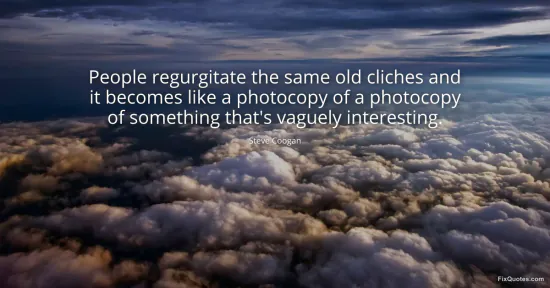 Coogan, Steve. "People regurgitate the same old cliches and it becomes like a photocopy of a photocopy of something that's vaguely interesting." FixQuotes. January 17, 2026. https://fixquotes.com/quotes/people-regurgitate-the-same-old-cliches-and-it-63474/.
