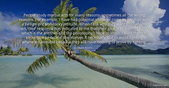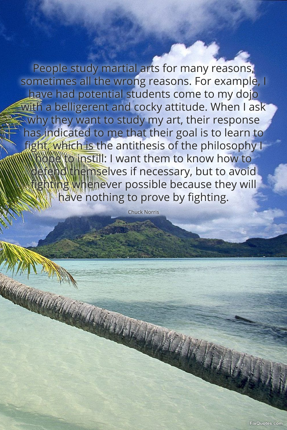 Norris, Chuck. (2026, March 20). People study martial arts for many reasons, sometimes all the wrong reasons. For example, I have had potential students come to my dojo with a belligerent and cocky attitude. When I ask why they want to study my art, their response has indicated to me that their goal is to learn to fight, which is the antithesis of the philosophy I hope to instill: I want them to know how to defend themselves if necessary, but to avoid fighting whenever possible because they will have nothing to prove by fighting. FixQuotes. https://fixquotes.com/quotes/people-study-martial-arts-for-many-reasons-186228/