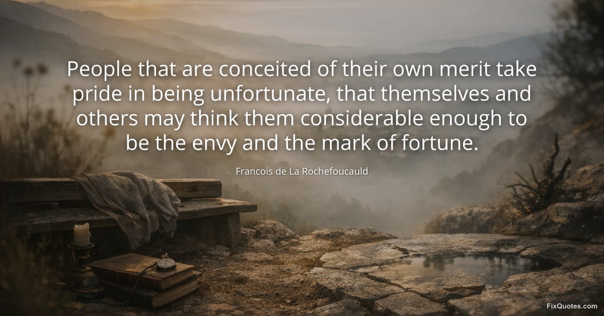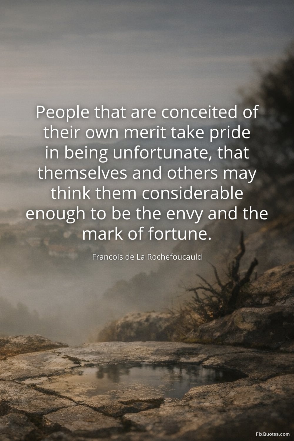Rochefoucauld, Francois de La. (2026, March 24). People that are conceited of their own merit take pride in being unfortunate, that themselves and others may think them considerable enough to be the envy and the mark of fortune. FixQuotes. https://fixquotes.com/quotes/people-that-are-conceited-of-their-own-merit-take-13118/