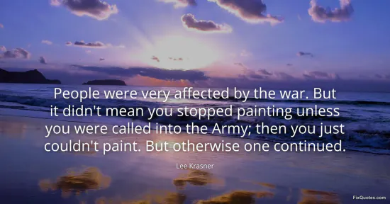 Krasner, Lee. "People were very affected by the war. But it didn't mean you stopped painting unless you were called into the Army; then you just couldn't paint. But otherwise one continued." FixQuotes. January 15, 2026. https://fixquotes.com/quotes/people-were-very-affected-by-the-war-but-it-didnt-149378/.