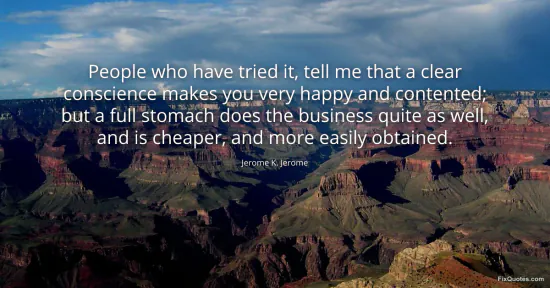 Jerome, Jerome K. (2026, January 18). People who have tried it, tell me that a clear conscience makes you very happy and contented; but a full stomach does the business quite as well, and is cheaper, and more easily obtained. FixQuotes. https://fixquotes.com/quotes/people-who-have-tried-it-tell-me-that-a-clear-23612/