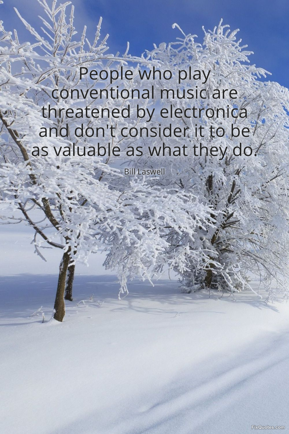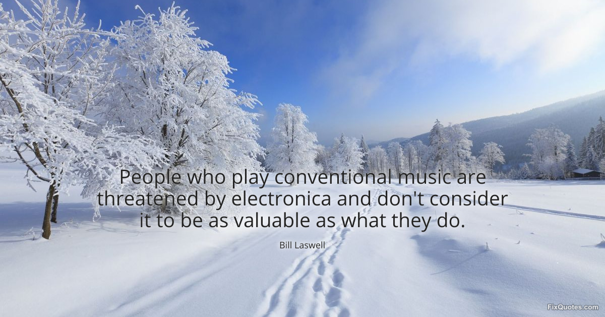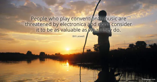 Laswell, Bill. "People who play conventional music are threatened by electronica and don't consider it to be as valuable as what they do." FixQuotes. January 17, 2026. https://fixquotes.com/quotes/people-who-play-conventional-music-are-threatened-39825/.