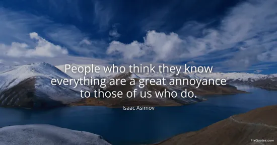 Asimov, Isaac. "People who think they know everything are a great annoyance to those of us who do." FixQuotes. February 16, 2026. https://fixquotes.com/quotes/people-who-think-they-know-everything-are-a-great-20043/.