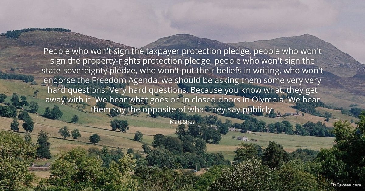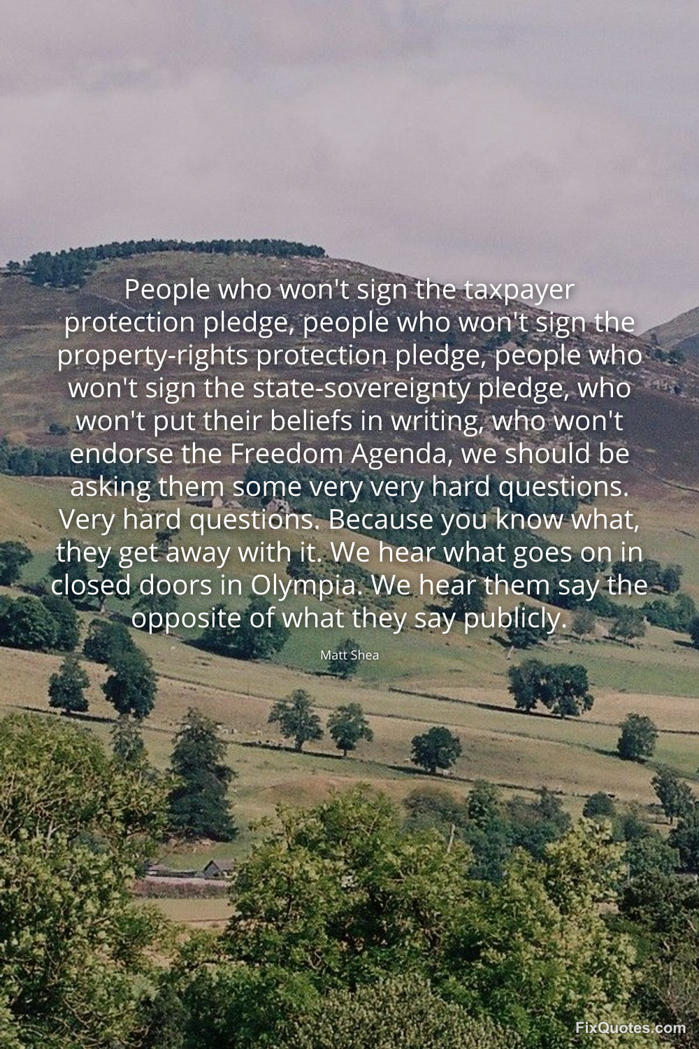 Shea, Matt. "People who won't sign the taxpayer protection pledge, people who won't sign the property-rights protection pledge, people who won't sign the state-sovereignty pledge, who won't put their beliefs in writing, who won't endorse the Freedom Agenda, we should be asking them some very very hard questions. Very hard questions. Because you know what, they get away with it. We hear what goes on in closed doors in Olympia. We hear them say the opposite of what they say publicly." FixQuotes. February 9, 2026. https://fixquotes.com/quotes/people-who-wont-sign-the-taxpayer-protection-185022/.