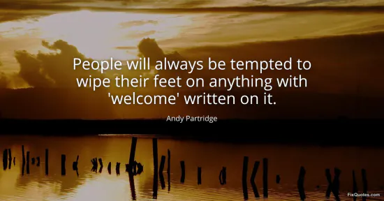 Partridge, Andy. "People will always be tempted to wipe their feet on anything with 'welcome' written on it." FixQuotes. January 17, 2026. https://fixquotes.com/quotes/people-will-always-be-tempted-to-wipe-their-feet-37347/.
