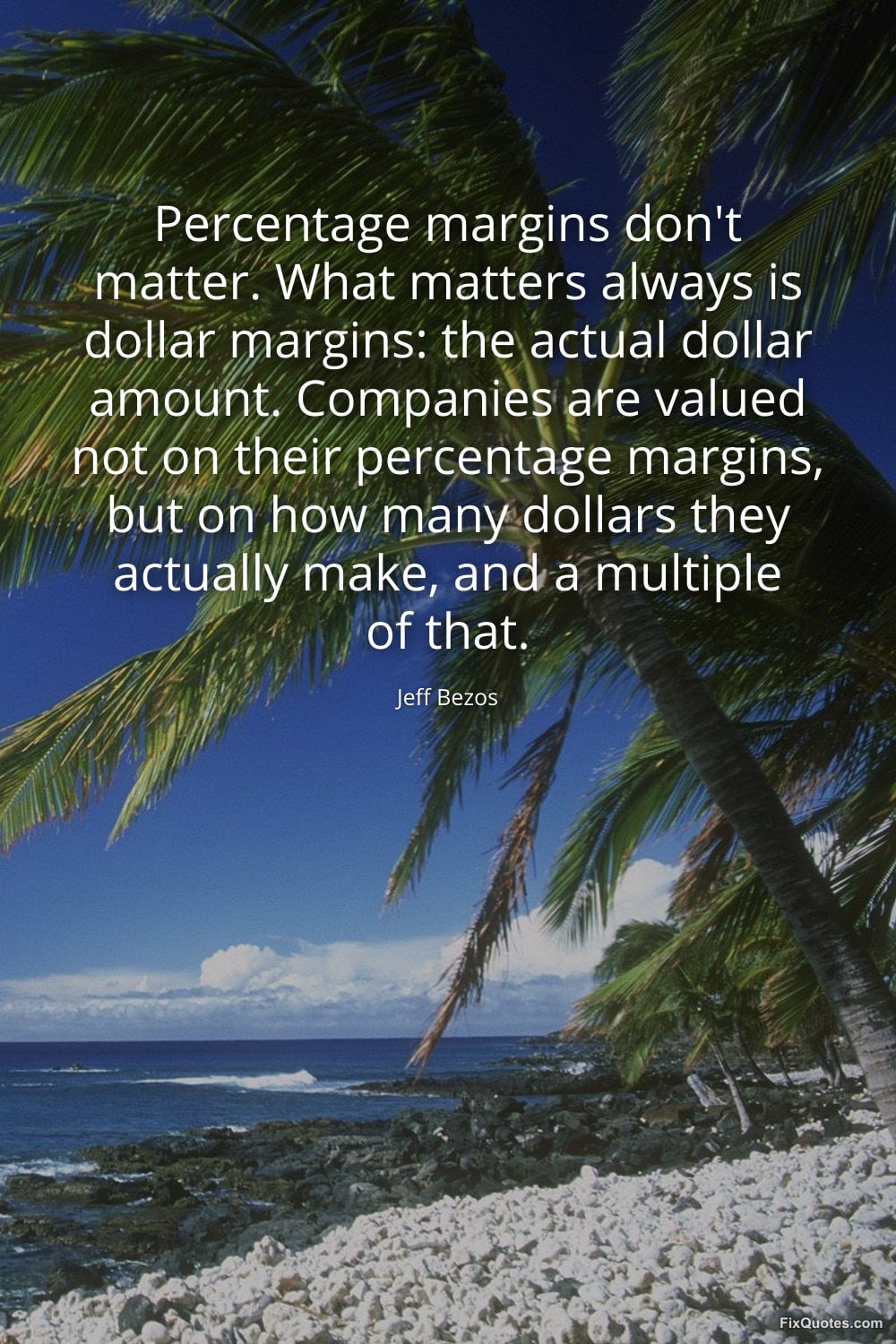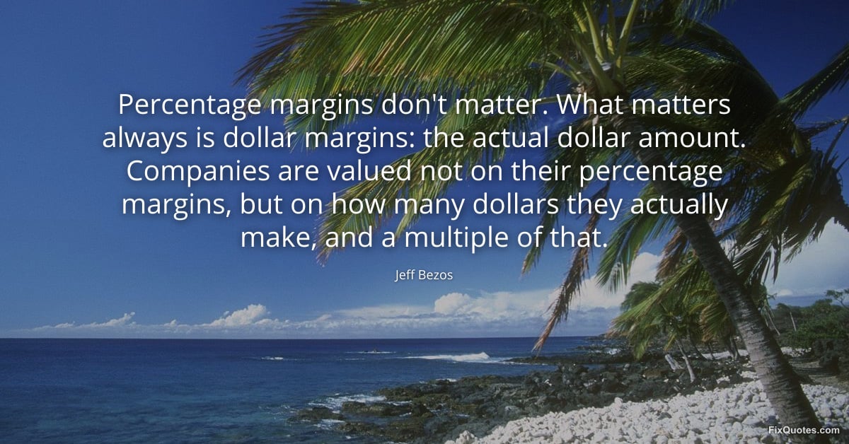 Bezos, Jeff. (2026, March 25). Percentage margins don't matter. What matters always is dollar margins: the actual dollar amount. Companies are valued not on their percentage margins, but on how many dollars they actually make, and a multiple of that. FixQuotes. https://fixquotes.com/quotes/percentage-margins-dont-matter-what-matters-186364/