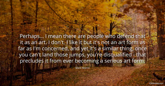 Morris, Mark. "Perhaps... I mean there are people who defend that it as an art. I don't. I like it but it's not an art form as far as I'm concerned, and yet it's a similar thing, once you can't land those jumps, you're disqualified - that precludes it from ever becoming a serious art form." FixQuotes. January 15, 2026. https://fixquotes.com/quotes/perhaps-i-mean-there-are-people-who-defend-that-146857/.