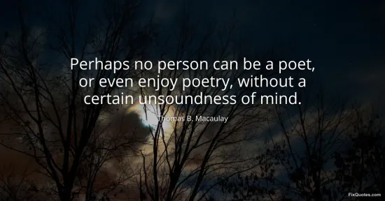 Macaulay, Thomas B. "Perhaps no person can be a poet, or even enjoy poetry, without a certain unsoundness of mind." FixQuotes. January 16, 2026. https://fixquotes.com/quotes/perhaps-no-person-can-be-a-poet-or-even-enjoy-110356/.