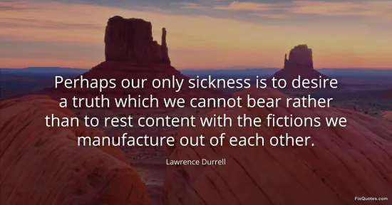 Durrell, Lawrence. "Perhaps our only sickness is to desire a truth which we cannot bear rather than to rest content with the fictions we manufacture out of each other." FixQuotes. January 18, 2026. https://fixquotes.com/quotes/perhaps-our-only-sickness-is-to-desire-a-truth-7560/.