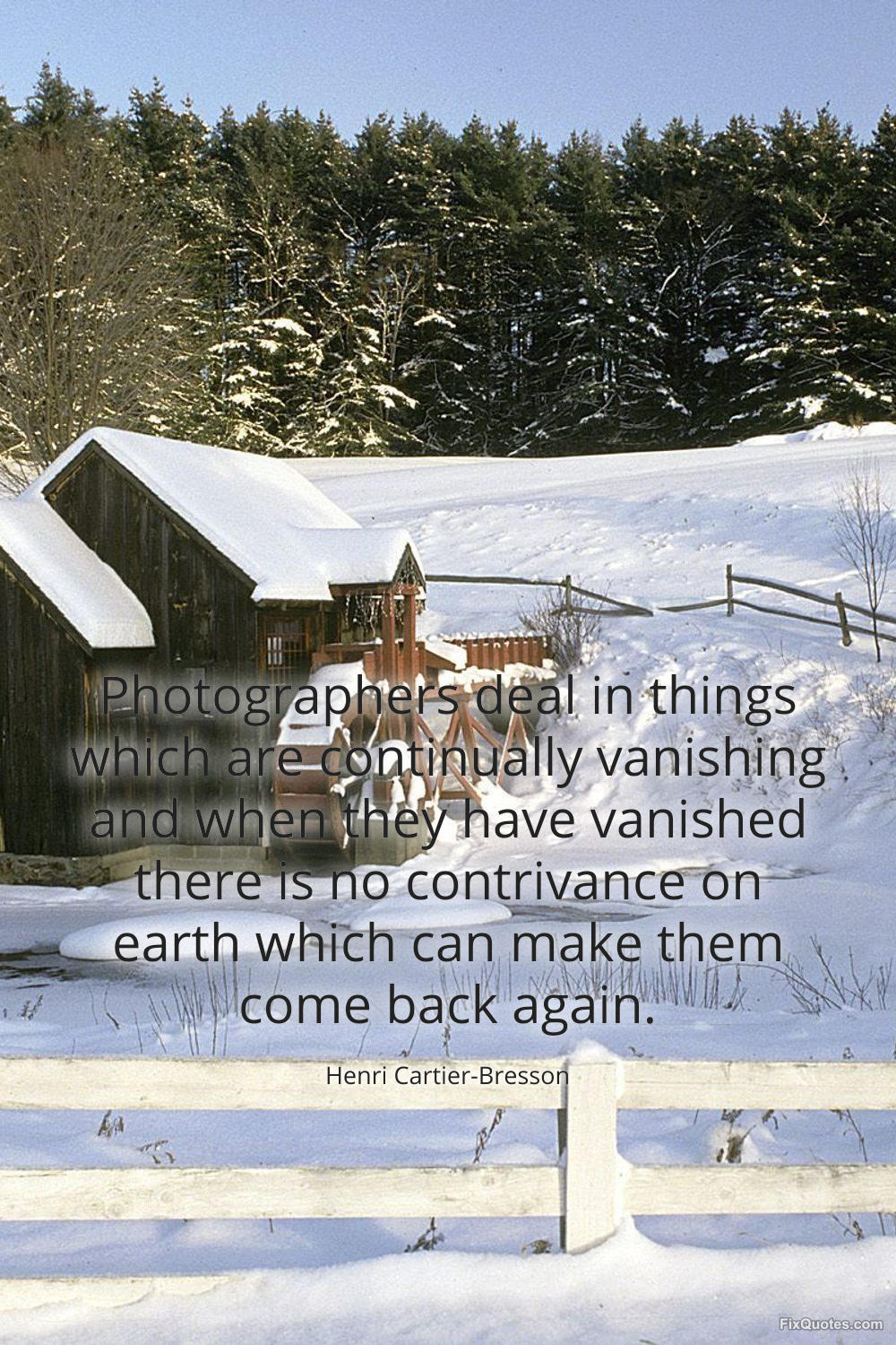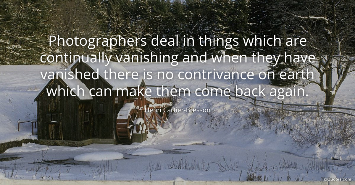 Cartier-Bresson, Henri. "Photographers deal in things which are continually vanishing and when they have vanished there is no contrivance on earth which can make them come back again." FixQuotes. January 15, 2026. https://fixquotes.com/quotes/photographers-deal-in-things-which-are-144123/.