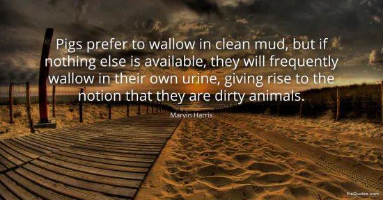 Harris, Marvin. "Pigs prefer to wallow in clean mud, but if nothing else is available, they will frequently wallow in their own urine, giving rise to the notion that they are dirty animals." FixQuotes. January 15, 2026. https://fixquotes.com/quotes/pigs-prefer-to-wallow-in-clean-mud-but-if-nothing-127726/.