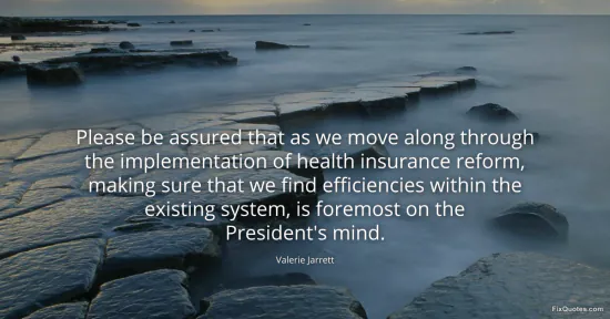 Jarrett, Valerie. (2026, January 16). Please be assured that as we move along through the implementation of health insurance reform, making sure that we find efficiencies within the existing system, is foremost on the President's mind. FixQuotes. https://fixquotes.com/quotes/please-be-assured-that-as-we-move-along-through-122065/