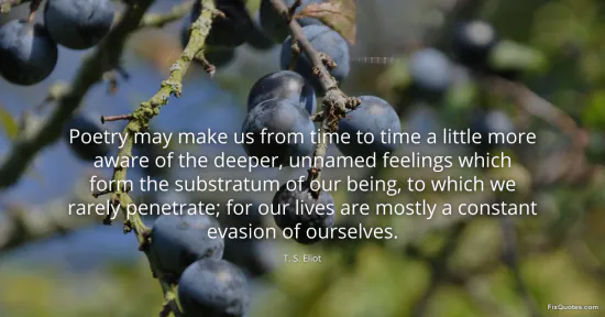 Eliot, T. S. "Poetry may make us from time to time a little more aware of the deeper, unnamed feelings which form the substratum of our being, to which we rarely penetrate; for our lives are mostly a constant evasion of ourselves." FixQuotes. January 17, 2026. https://fixquotes.com/quotes/poetry-may-make-us-from-time-to-time-a-little-29039/.