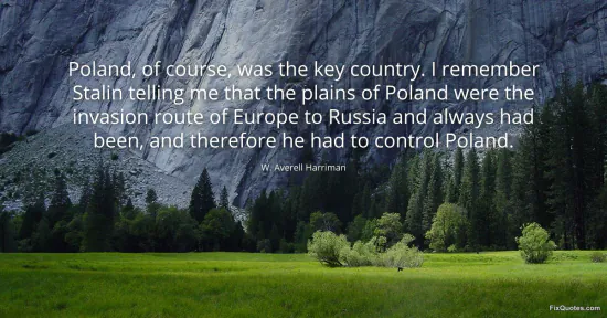 Harriman, W. Averell. "Poland, of course, was the key country. I remember Stalin telling me that the plains of Poland were the invasion route of Europe to Russia and always had been, and therefore he had to control Poland." FixQuotes. January 15, 2026. https://fixquotes.com/quotes/poland-of-course-was-the-key-country-i-remember-165150/.