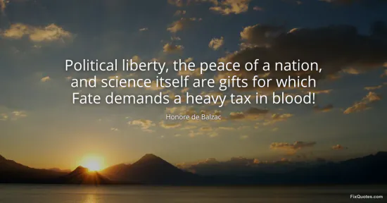 Balzac, Honore de. (2026, January 17). Political liberty, the peace of a nation, and science itself are gifts for which Fate demands a heavy tax in blood! FixQuotes. https://fixquotes.com/quotes/political-liberty-the-peace-of-a-nation-and-24226/